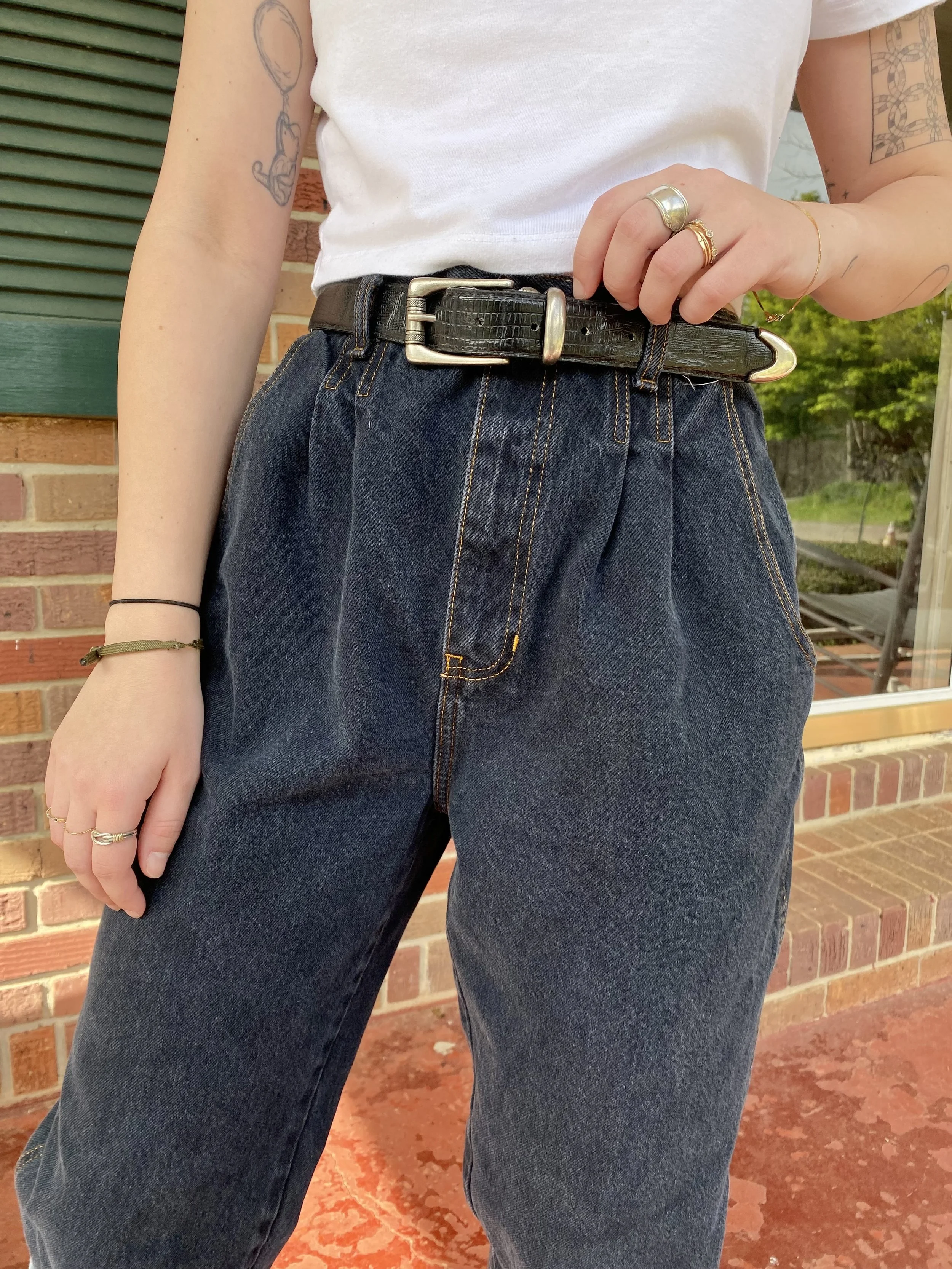 vintage dark-wash, high-waisted, pleated jeans. Please note that I have these pinned on me to show intended fit. Check the measurements listed below.